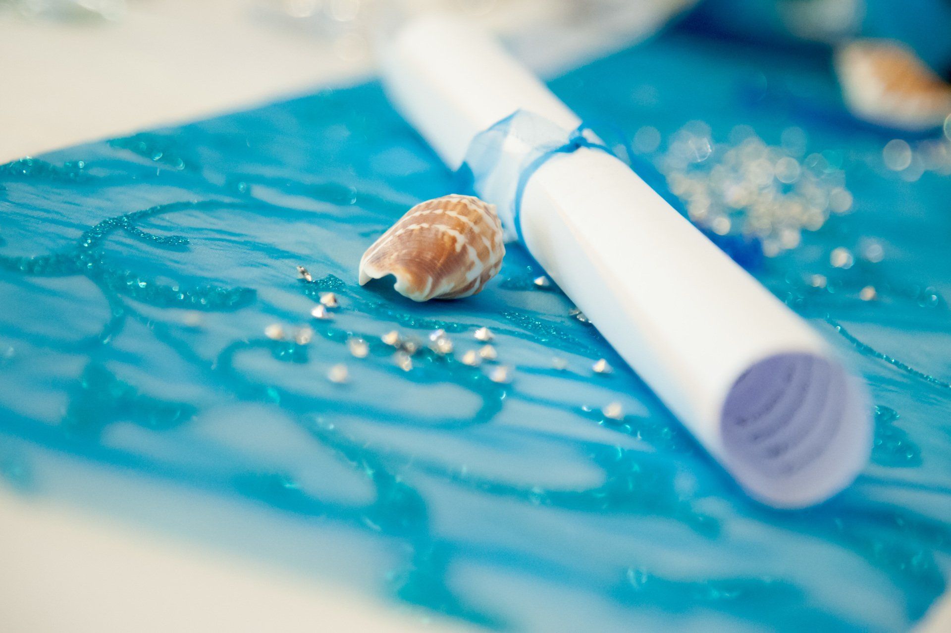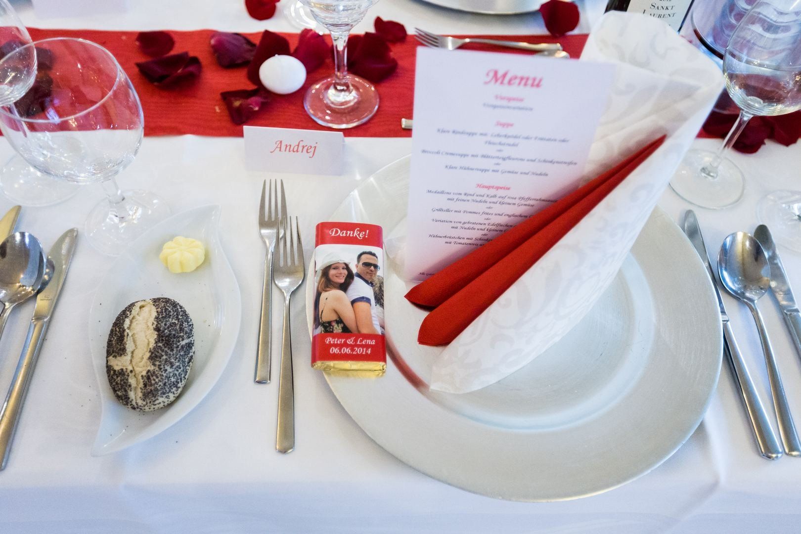 festl. Tischgedeck mit Menürolle am Tisch